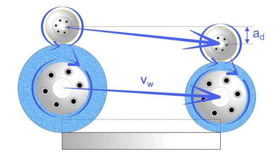 The amount of dressing per grinding wheel revolution directly affects the effective depth Rts of the grinding wheel, i.e., the greater the infeed depth, the greater the effective depth. However, this only applies if the roll-out time is not considered. The infeed depth ad should ideally be between 0.5 µm and 1.5 µm per revolution of the grinding wheel. The maximum infeed depth should not exceed 1.5 µm per revolution of the grinding wheel, as excessive infeed rates reduce the service life of the dressing roll or even damage the dressing roll.