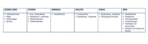 Knochenbohrer, die Löcher bohren, um eben Platten oder Schienen am gebrochenen Knochen zu fixieren, sowie Dentalbohrer und -implantate werden mit den Maschinen der Werkzeugschleifer hergestellt. Besonders scharfe Schneiden und ein exakter Rundlauf sind bei diesen Bohrern nötig. Gleiches gilt für Prothesen etwa in Schulter oder Hüfte. WALTER Maschinen wie die HELITRONIC MINI POWER oder HELITRONIC MICRO kommen dabei zum Einsatz.