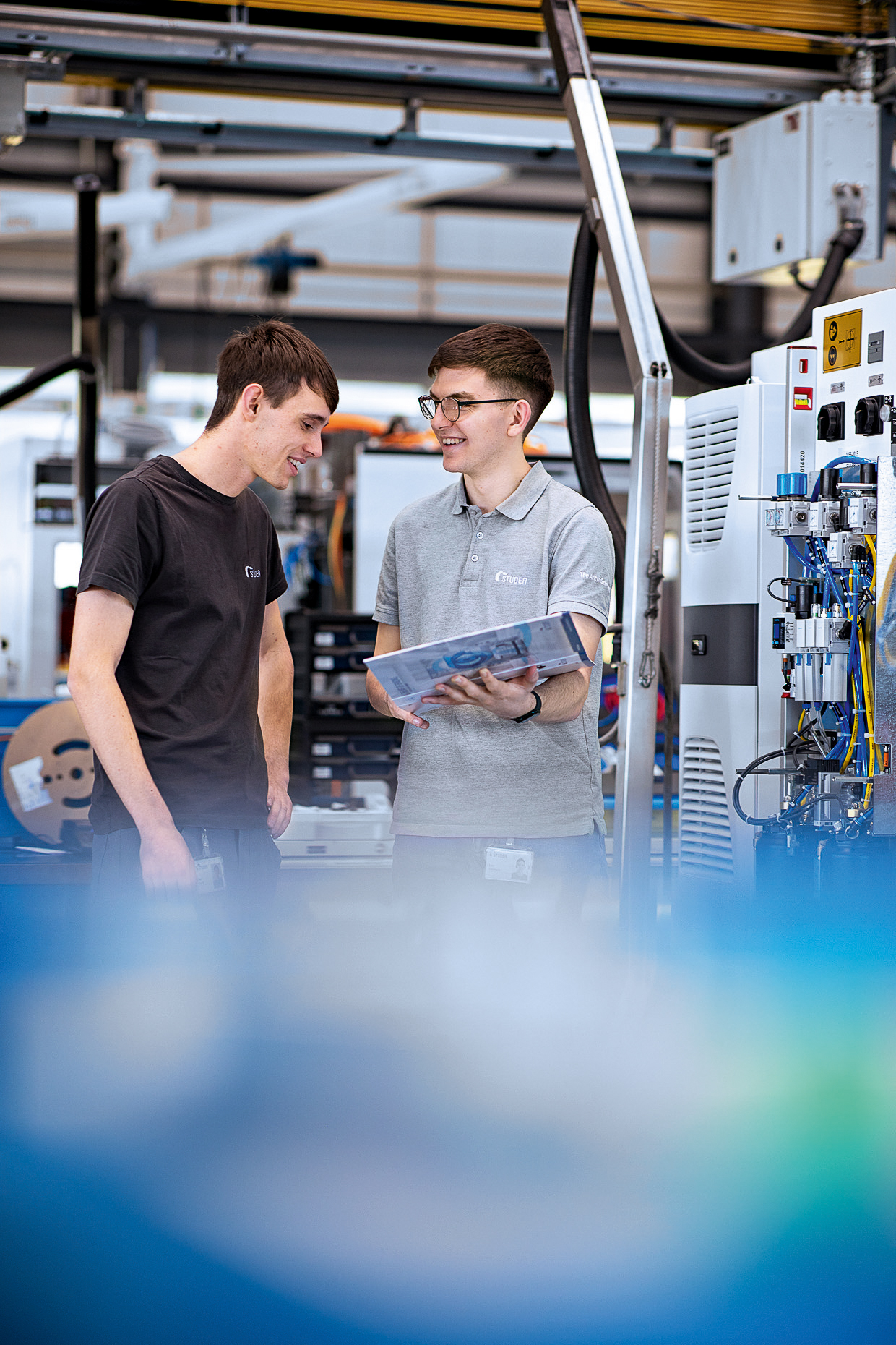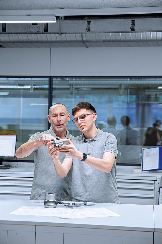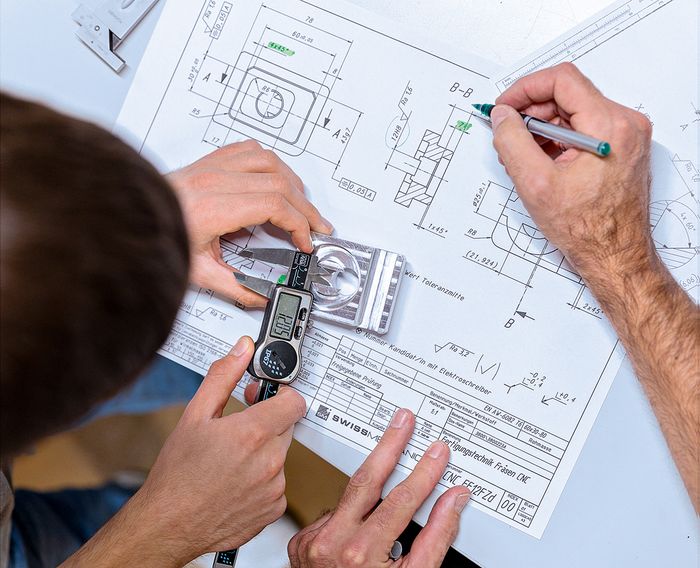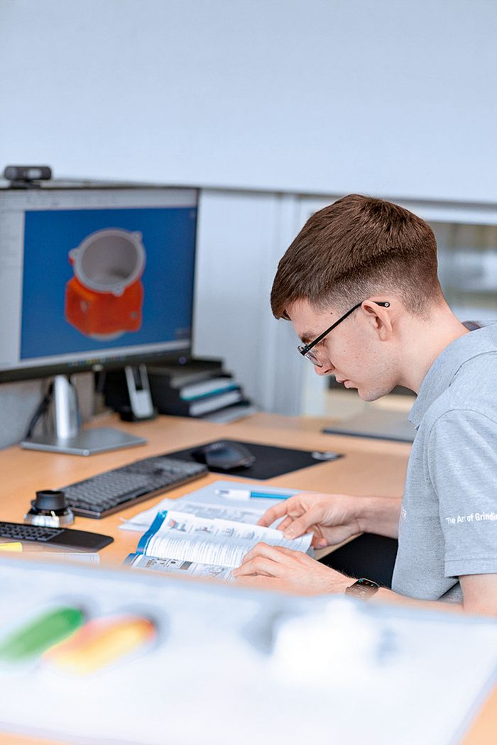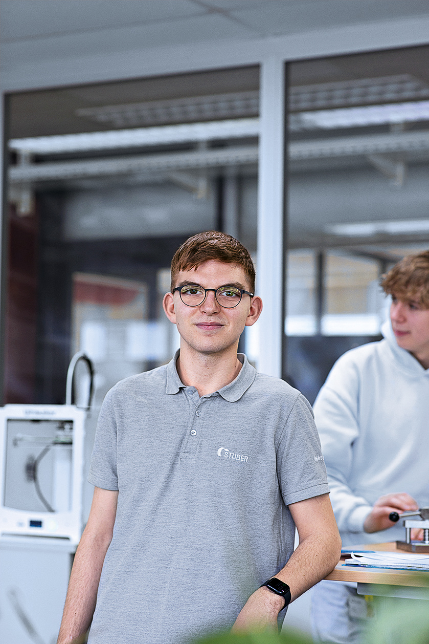 „Aber auch auf das saubere Arbeiten mit Papier, Bleistift, Lineal, Zirkel und Messschieber legen wir in unserer Ausbildung Wert“, sagt Roger Leuenberger, Leiter der Berufsbildung bei STUDER. Das auf die Herstellung von hochpräzisen Hightech-Rundschleifmaschinen spezialisierte Unternehmen hat mit rund zehn Prozent einen hohen Anteil von Lernenden unter der Mitarbeiterschaft. „Weil wir einen Großteil des von uns benötigten Personals selbst ausbilden, sind wir auch in Zeiten des Fachkräftemangels gut aufgestellt”, erläutert Leuenberger. Die Konstruktionsfachleute entwerfen bei STUDER zum Beispiel Teile für die eigene Produktion, welche später Mitarbeitende mit einem Abschluss in Polymechanik an den Rundschleifmaschinen herstellen.