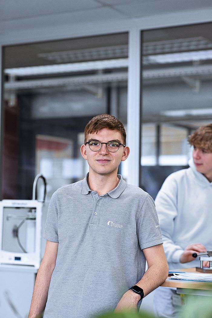 Tatsächlich ist STUDER regelmäßig auf den vorderen Plätzen vertreten. Als Salzmann bei den SwissSkills vergangenes Jahr den ersten Platz belegte, holte sein Kollege Noah Rossel in der Kategorie „Automatiker/-in EFZ” die Silbermedaille. Und dann ist da noch Polymechaniker Gil Beutler, der von 2020 an bei den Swiss-, Euro- und WorldSkills mit Gold, Silber und Bronze einen ganzen Satz an Edelmetall für STUDER gewonnen hat. „Unsere Medaillenträger sind Botschafter für die Ausbildung insgesamt”, erklärt Ausbildungsleiter Leuenberger. Denn solche Erfolge machen STUDER als Ausbildungsstätte für junge Talente besonders attraktiv, die ihr Know-how bei den Besten der Welt erlernen wollen. Zudem investiert STUDER laufend in modernste Ausbildungsmaschinen für die Lehrwerkstatt – „wie gerade erst mit zwei neuen CNC-Maschinen“, ergänzt Leuenberger.