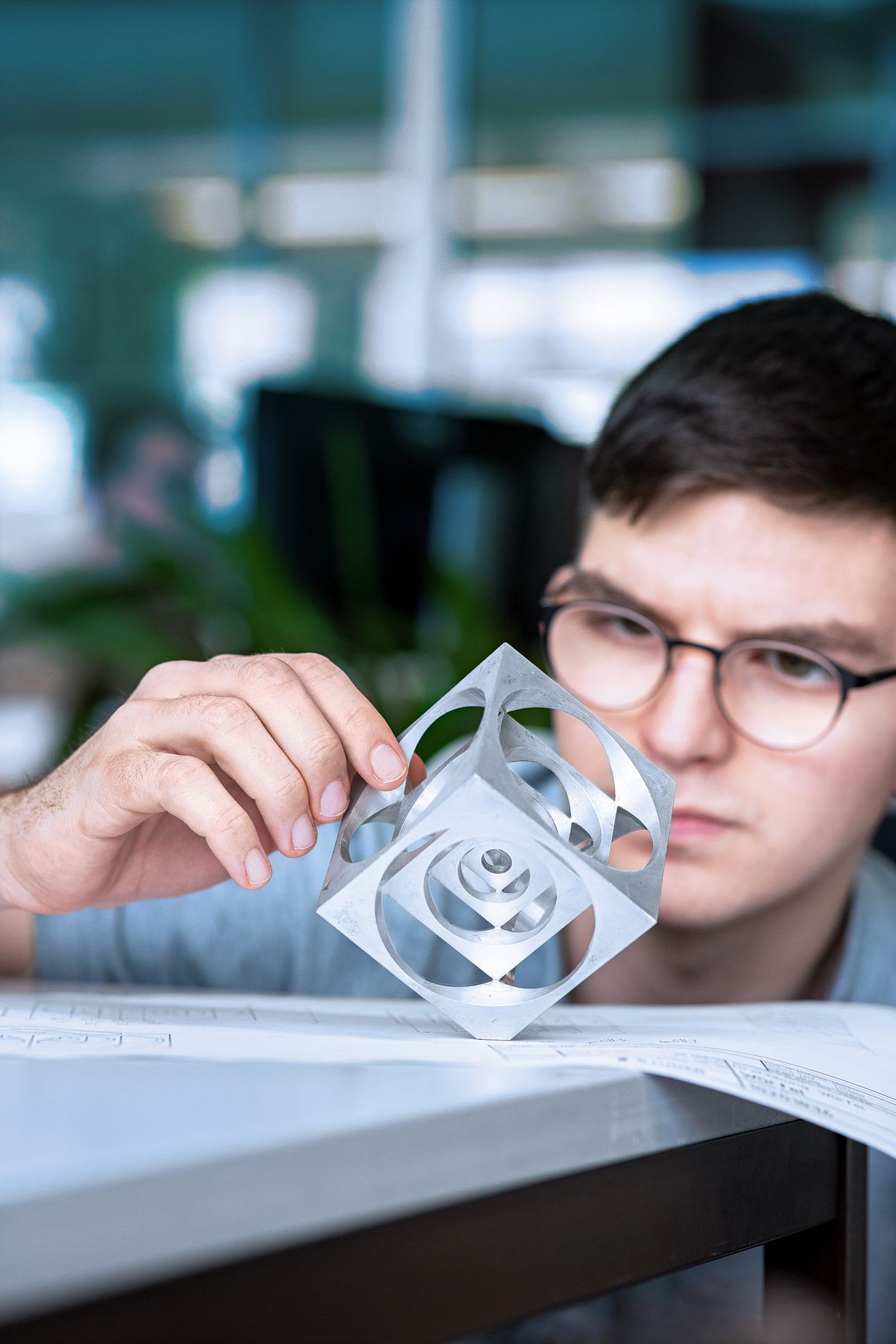 Beim Training in der Lehrwerkstatt schaut Salzmann vom Computermonitor immer wieder konzentriert auf einen technischen Plan aus Papier, der auf seinem Schreibtisch liegt. Für Laien mag das Labyrinth aus schwarz-weißen Linien, Kreisen, Winkeln und Maßeinheiten nur schwer zu durchschauen sein, doch er erkennt darin schnell einen Druckausgleich-Verschluss für hydraulische Systeme. Diesen muss er nun hochpräzise in 3D in der CAD-Software nachbauen. Ist diese Aufgabe gelöst, folgt das nächste Bauteil. Sei es ein Gokart-Chassis, eine Ventilspindel oder eine Lenkrolle.