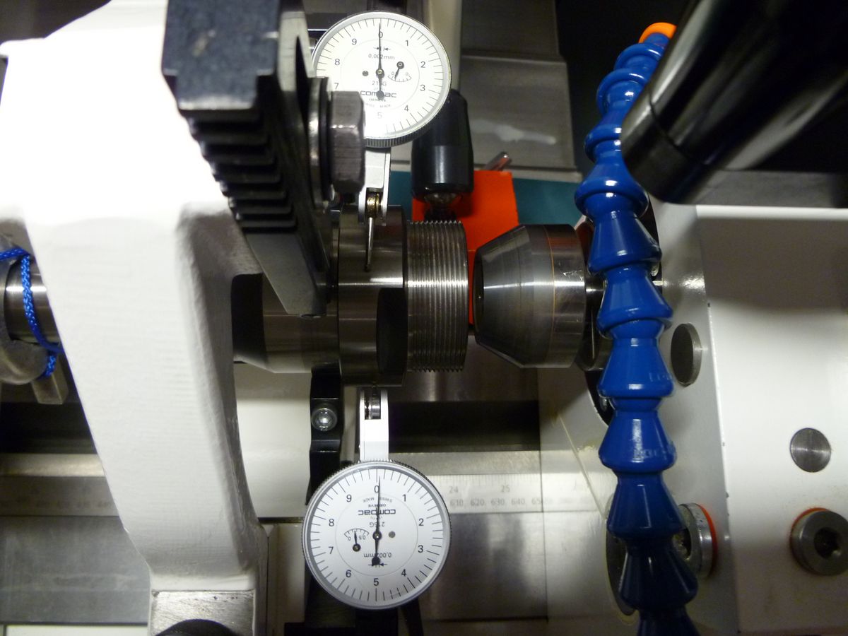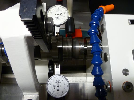 A dial indicator must be applied at the top and side, to ensure that the workpiece is correctly positioned. The tailstock center remains in position during this process.