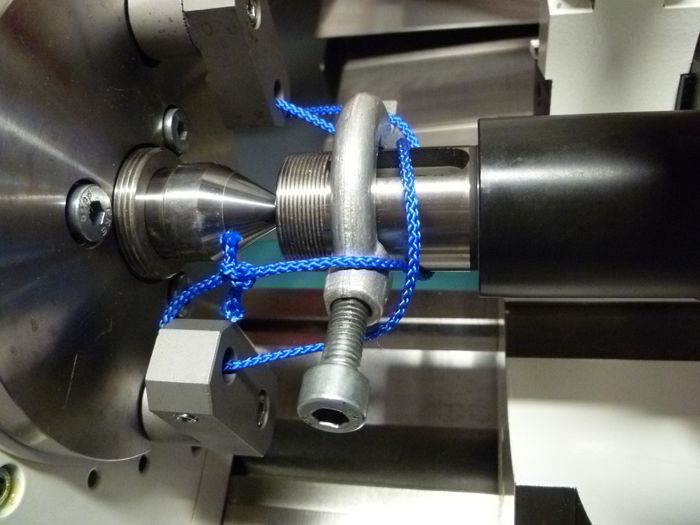 Now thread a rope in crosswise between the two locking head drivers and the grinding heart, as shown. Do not over-tighten, so that the workpiece can be removed again and later reclamped without loosening the rope. The part is then pulled onto the center by twisting.