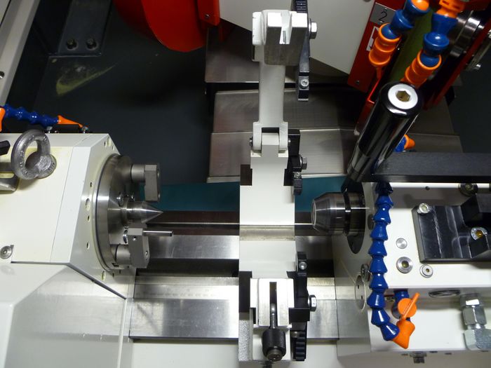 The "rope trick" is a way of simultaneously driving parts, which are clamped with a center and steady rest, and pulling them back onto the center. The condition for this is that the center can be locked. This variant is primarily intended for small to medium-sized components.