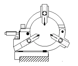 Clamp workpiece between centers again. Now carefully set the two lower jaws to the ground steady rest Ø and tighten. Adjust the upper jaw so that the clamp is not completely closed, so that a light pressure can be exerted with the sprung knurled-head screw.