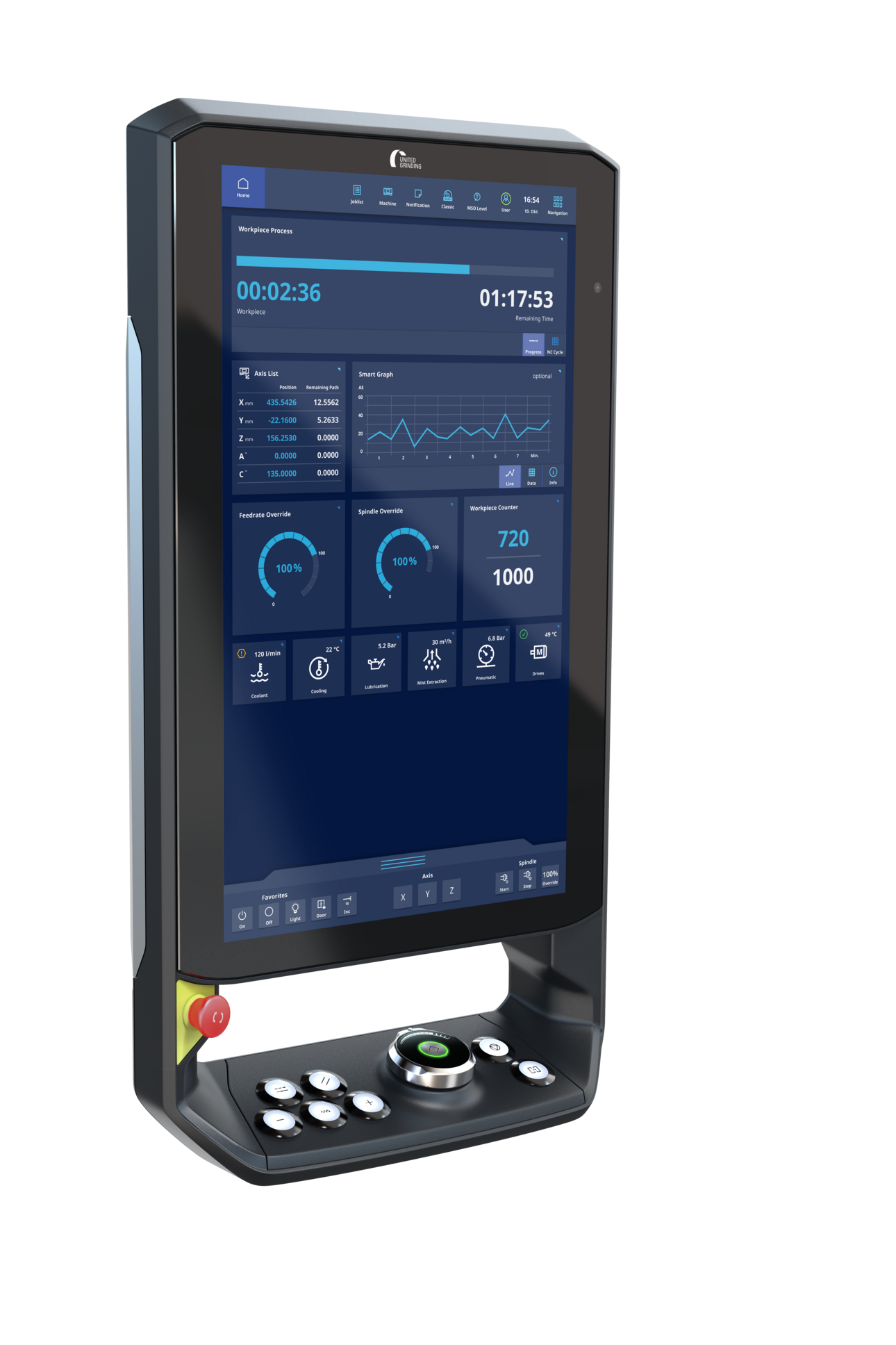 C.O.R.E. from the UNITED GRINDING Group brings to life a new machine interaction concept based on a modern hardware and software architecture. It standardizes operation of all machine tools from the UNITED GRINDING Group, with a new 24-inch multi-touch C.O.R.E. panel offering intuitive controls similar to a smartphone and personalized customization options. The clean design of the C.O.R.E. panel features only a few buttons, ensuring clean visuals. The virtual function keys are also only displayed when needed, further reducing complexity and eliminating potential sources of error. The role-specific interface, with the option of limiting the display to relevant information for the user role, also promotes simplification. In this way, C.O.R.E. improves the working experience both for the machine's operators as well as set-up and maintenance personnel. Another new feature is the integrated front camera, which enables quick and easy support also via video calls directly from the panel.