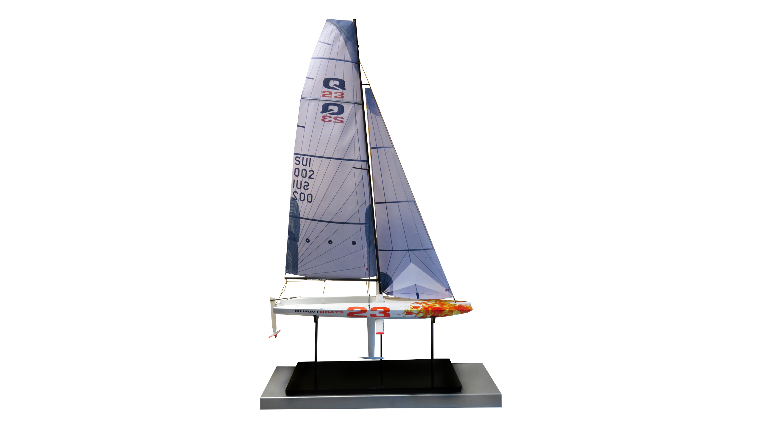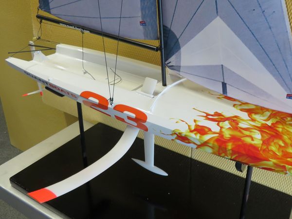 The Swiss Museum of Transport has set up a number of showcases for "foil technology in the maritime sector," prominently featuring the Quant 23. The basic model was produced by Irpd AG, which prepared the 3D data and then lasered the model in PA12. In addition, the model was painted and foiled.