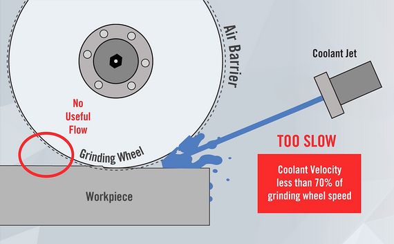 Grinding generates significant heat, so setting up an effective coolant delivery system is essential. Damaged or misaligned lines can prevent fluid from reaching the grind zone, reducing wheel performance and part quality. Surprisingly, sometimes a small tweak to this system is enough to fix an issue—even when coolant isn’t the obvious culprit. Coolant delivery can be checked by comparing nozzle pressure and machine flow rate against expected values. While excess flow mainly affects efficiency, excessive velocity can disrupt coolant penetration and raise temperatures—especially if jet speed exceeds wheel speed. For more on coolant velocity, see The Grinding Chronicles, Episode 3.