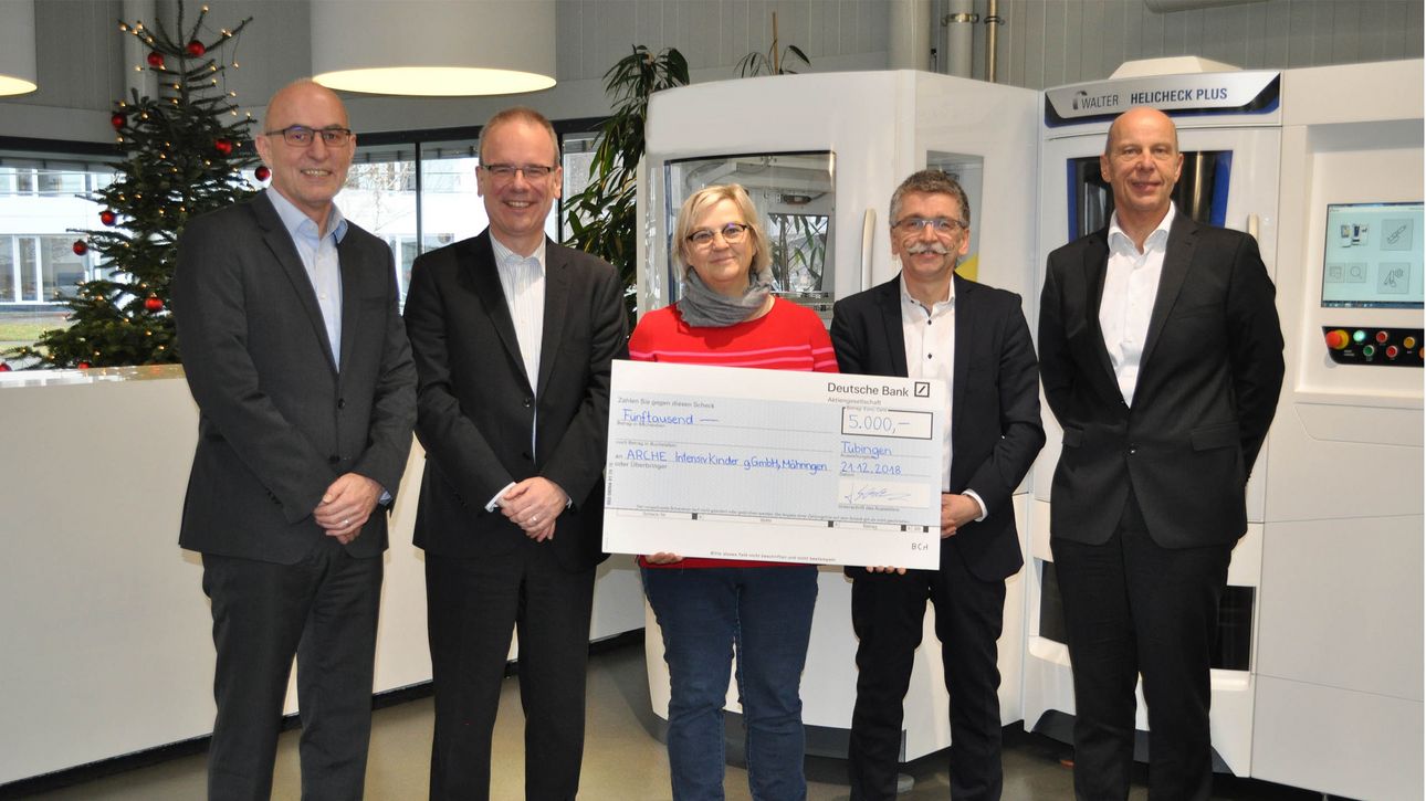A donation ceremony took place in the demo room of Walter Maschinenbau GmbH in Tübingen on December 21, 2018. Walter Maschinenbau GmbH's four directors, Jürgen Schock, Christian Dilger, Harri Rein and Gerhard Riester, handed over the check for 5,000 euros to CEO Sabine Vaihinger.