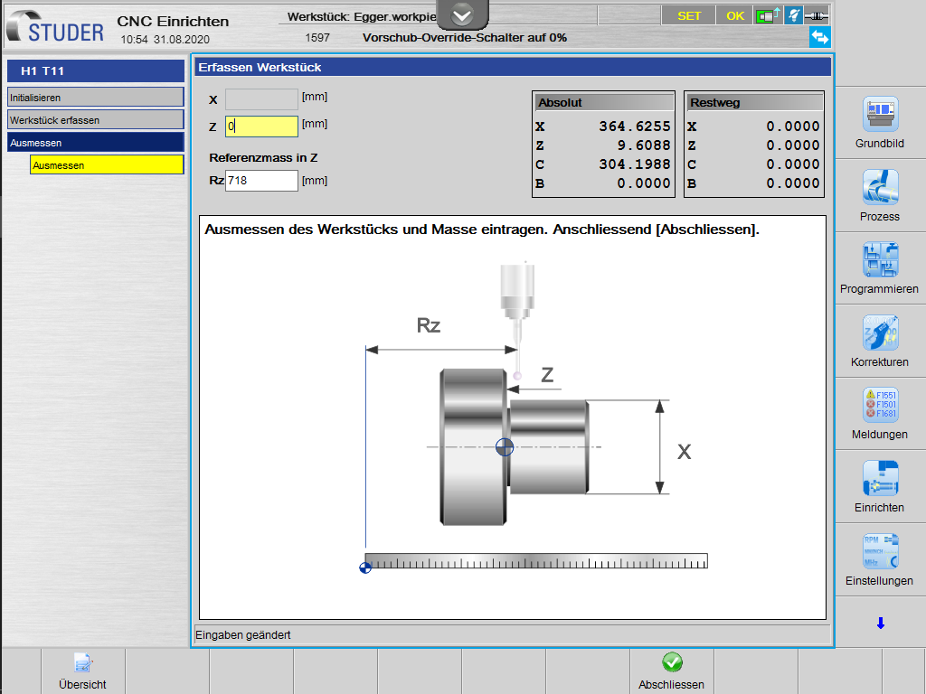 Cette valeur de 718 mm est maintenant saisie dans le champ Rz. Dans le champ Z, il faut aussi saisir la valeur 0 (zéro). Le premier enregistrement doit donc être effectué exactement avec le point zéro de la pièce à usiner.