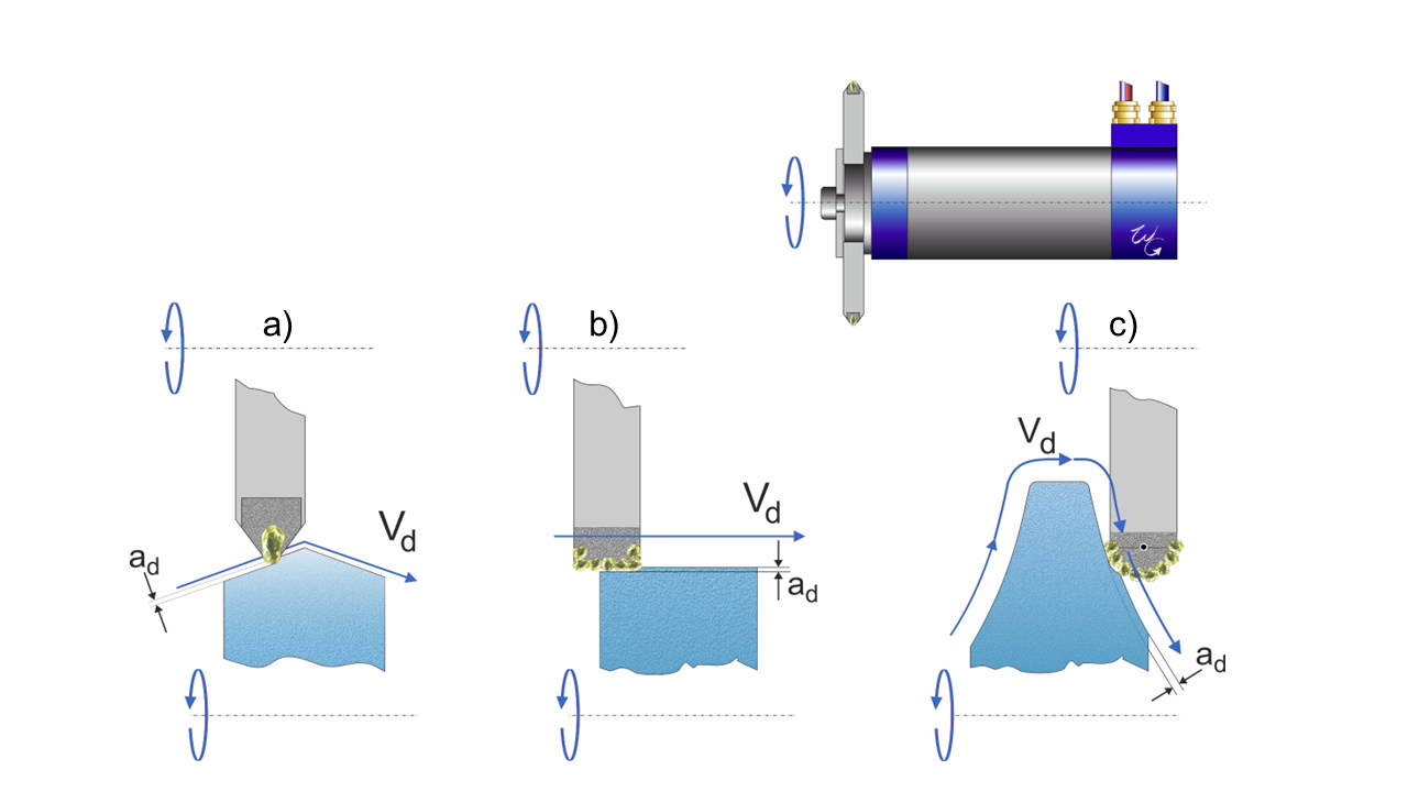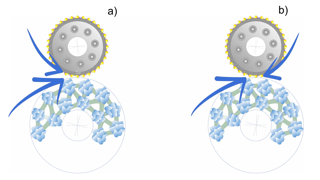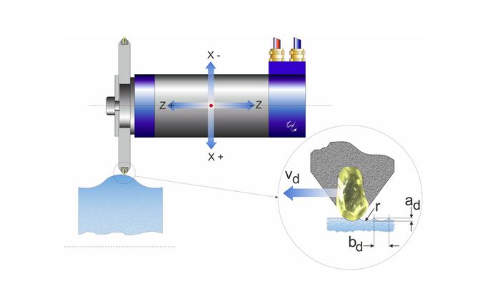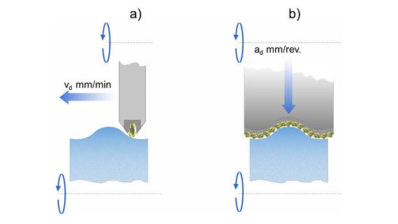 Lors du dressage synchrone, le diamant individuel frappe à la verticale sur la meule. Ce « coup de marteau » rend la meule plus tranchante et plus agressive. En revanche, lors du dressage en sens inverse, la trajectoire de contact d’un seul diamant provoque un « coup de frottement » sur la surface de la meule. Cette frappe « striante » permet d’obtenir une surface de la meule plus fine.