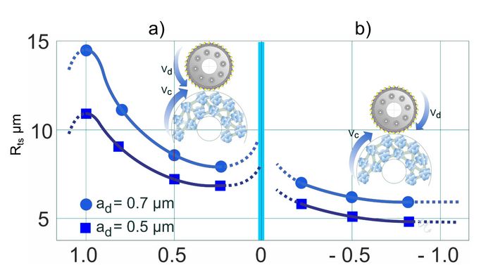 Plus le rapport des vitesses qd se rapproche de 1, plus la surface Rts de la meule devient rugueuse. Cependant, un rapport des vitesses de qd = 1 endommagerait la molette de dressage diamantée dû au mécanisme de pincement qui se produit entre les diamants et la meule. C’est pourquoi, lors du dressage sychnone, il est recommandé que le rapport des vitesses qd ne dépasse pas 0,8.