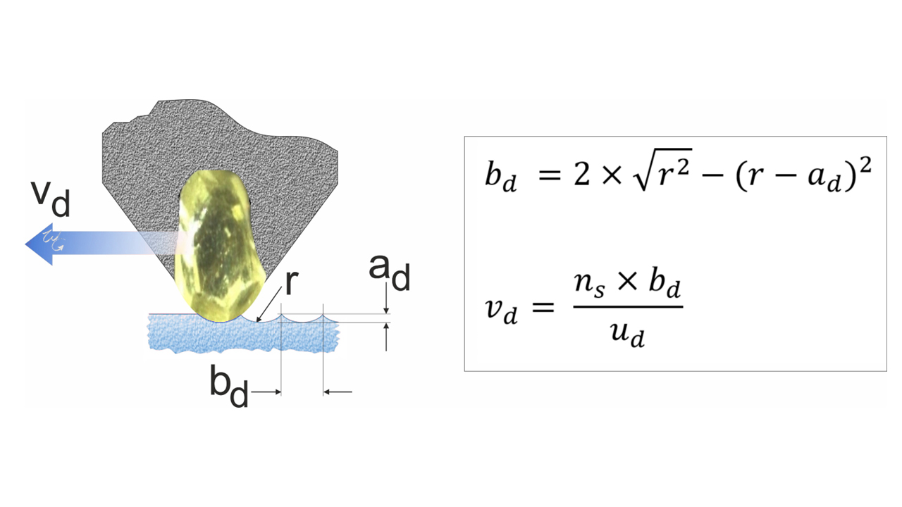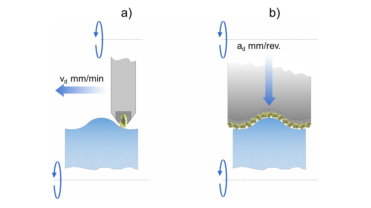 Comme pour le dressage avec des diamants monograin, l’avance de dressage v d se calcule une fois la largeur active bd.déduite.