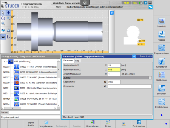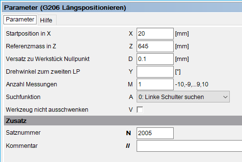 Nel programma del pezzo, vengono ora programmati di conseguenza i valori X e Z nel ciclo di posizionamento longitudinale. Nel nostro caso, la posizione di partenza del tastatore in X 50 e in Z corrisponde ai 718 mm misurati.