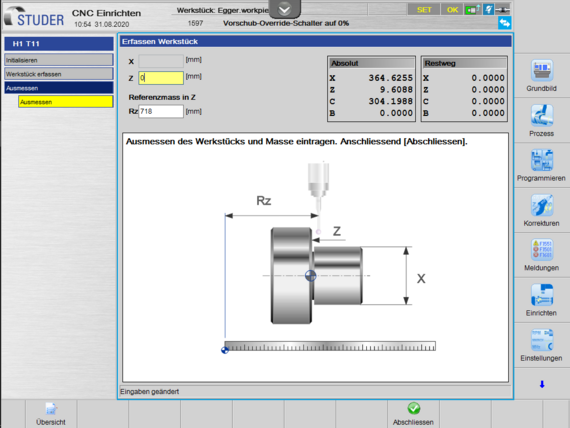 Il valore 718 mm viene ora inserito nel campo Rz. Inoltre nel campo Z deve essere inserito 0 (zero). Il rilevamento iniziale deve quindi essere effettuato esattamente al punto zero del pezzo.