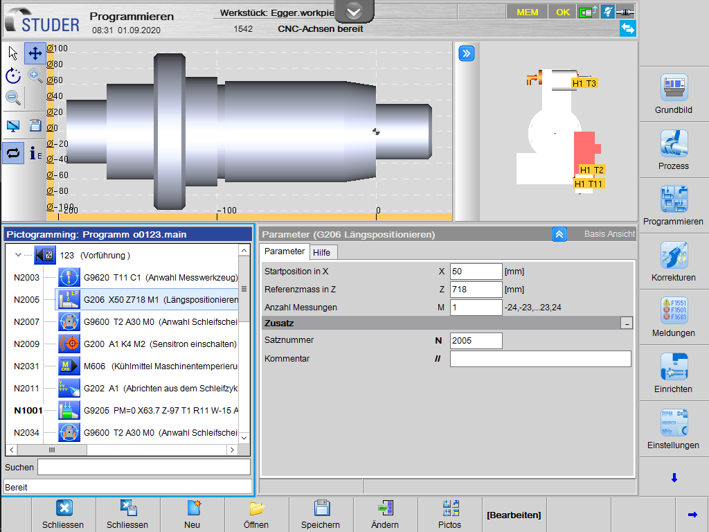 Nel programma del pezzo, vengono ora programmati di conseguenza i valori X e Z nel ciclo di posizionamento longitudinale. Nel nostro caso, la posizione di partenza del tastatore in X 50 e in Z corrisponde ai 718 mm misurati.