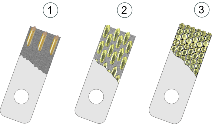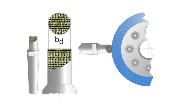 Con le piastrine, la larghezza effettiva bd rimane costante per tutto il tempo di funzionamento. Ciò garantisce una topografia costante della mola con parametri di ravvivatura costanti. Rispetto ai diamantatori a grana singola, le piastrine di ravvivatura hanno una larghezza effettiva bd costante e quindi forniscono valori di ravvivatura più costanti per tutta la loro durata. Gli esperti considerano le piastrine di ravvivatura, soprattutto con inserti CVD, la soluzione migliore per le ravvivatrici fisse nella rettifica cilindrica esterna. Le piastrine CVD con un unico stelo sono ideali per la ravvivatura di mole cilindriche interne.