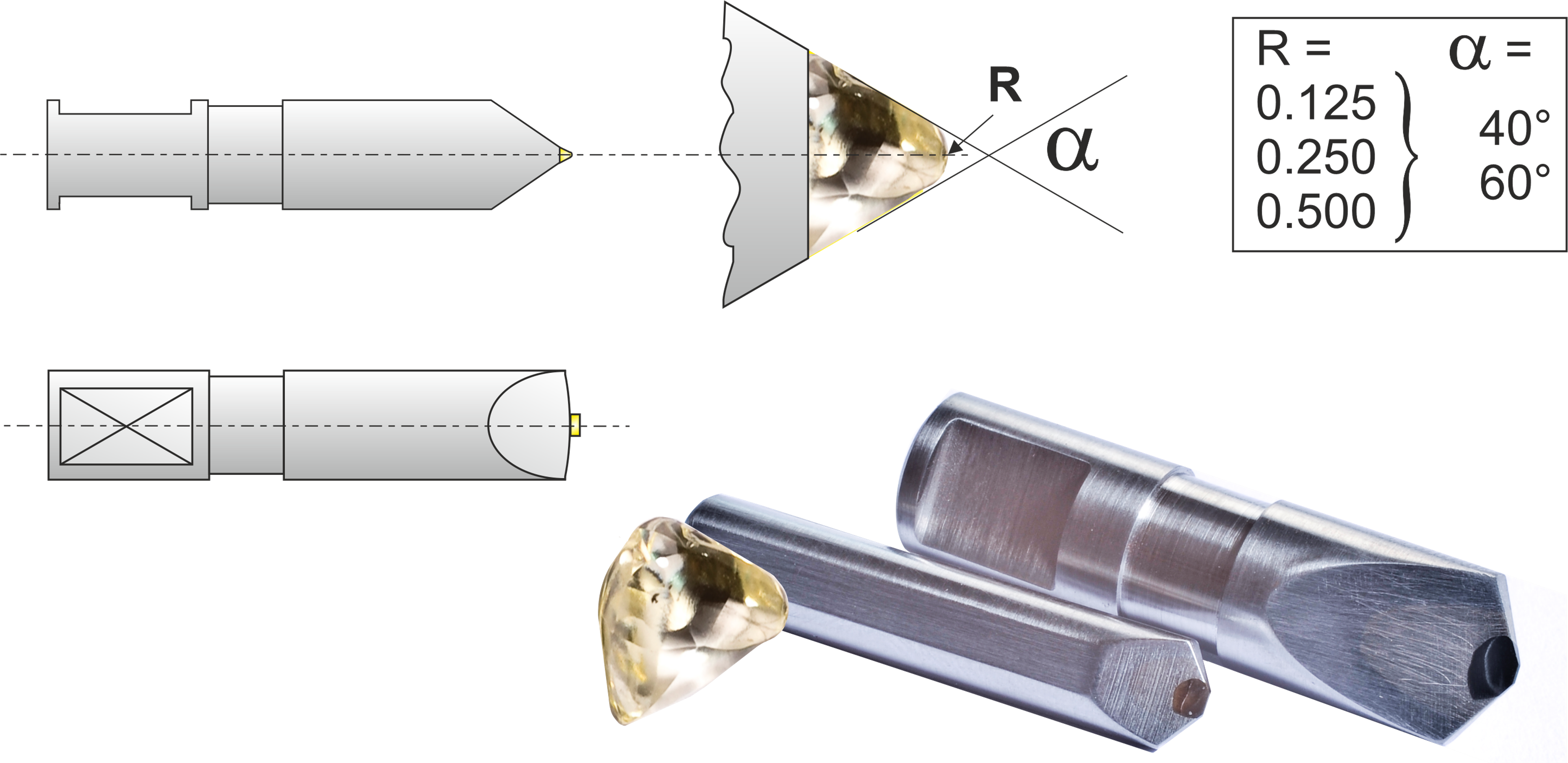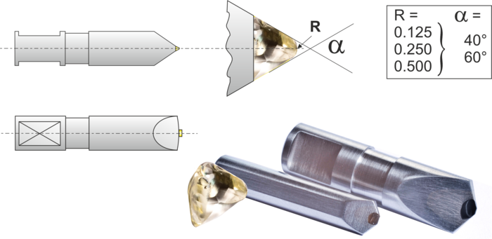 I diamantatori per profili sono utilizzati per creare profili precisi nelle mole per la rettifica cilindrica e superficiale, cosa che è possibile solo in misura limitata con i diamanti standard a grano singolo e le piastrine. I diamanti Maccoli, che hanno naturalmente un raggio, sono utilizzati per i diamantatori per profili. Questo raggio viene lappato con precisione a valori diversi (ad esempio 0,125 / 0,200 / 0,500 mm). In questo modo si garantisce che non si verifichino distorsioni della stampo durante la ravvivatura della guida. Per la ravvivatura di mole in ossido di alluminio e silicio sinterizzato, si raccomanda di non utilizzare questi utensili di alta qualità per la pre-profilatura, poiché il raggio di lappatura preciso potrebbe essere danneggiato.