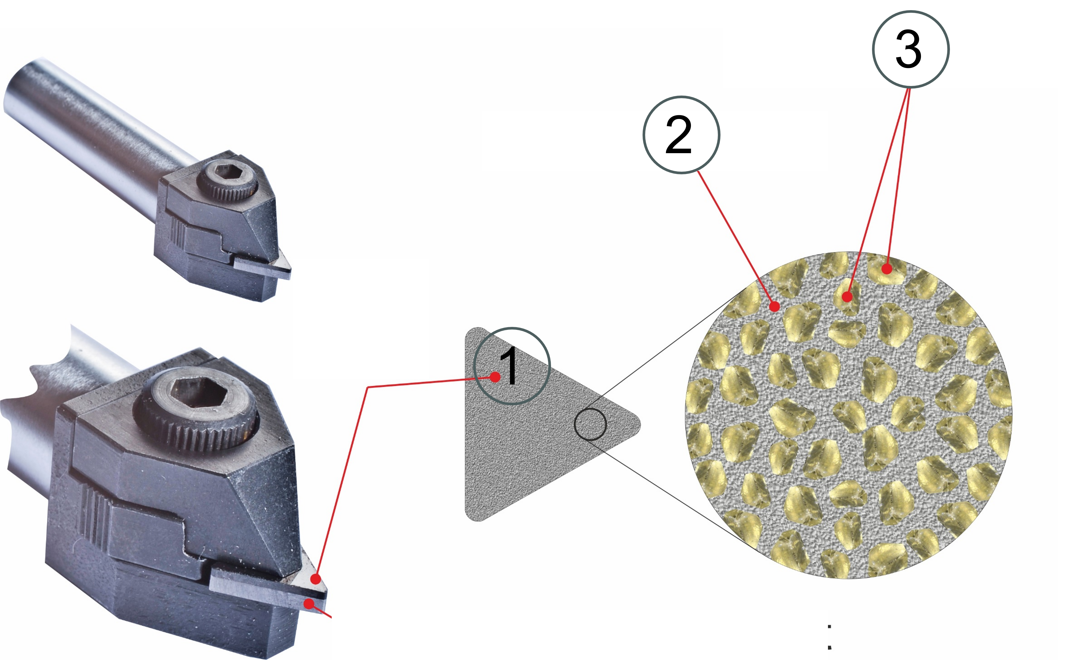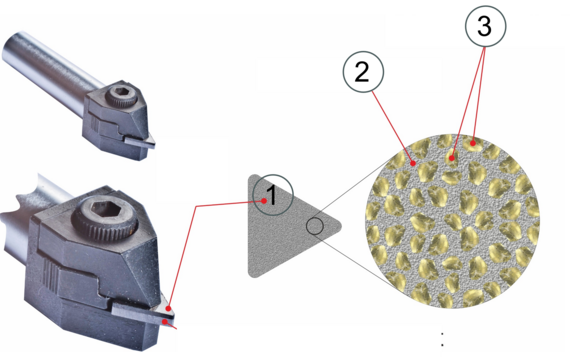 Gli inserti in PCD sono sinterizzati su un substrato di carburo e di solito hanno raggi d'angolo definiti (ad esempio 0,25 mm, 0,50 mm). Il PCD non è adatto alla ravvivatura delle mole in carburo di silicio (SiC), poiché in questo caso si verifica un'usura eccessiva. Occorre prestare attenzione anche alle mole in ossido di alluminio sinterizzato e si raccomanda di utilizzare piastrine PCD usurate per la pre-profilatura.