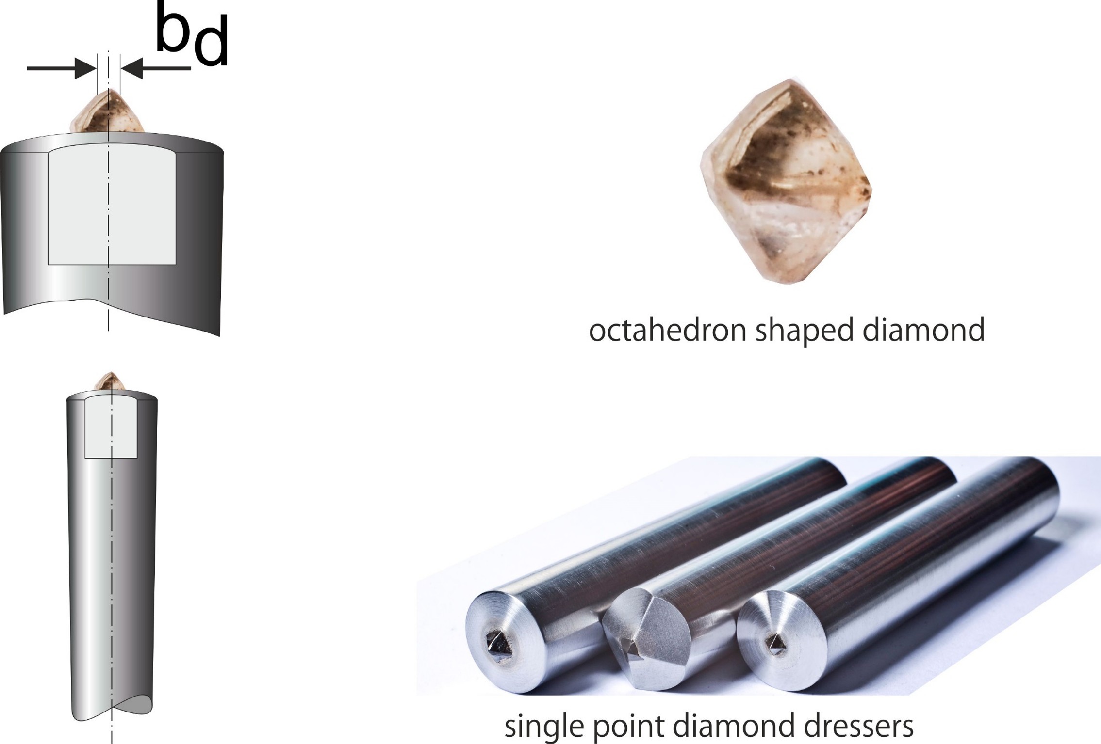I diamantatori a grano singolo utilizzano diamanti a forma di ottaedro. Se una punta è usurata, il diamante può essere riposizionato per inserire una nuova punta. I diamantatori a grano singolo rappresentano una soluzione economica e sono utilizzati universalmente per la rettifica cilindrica e superficiale interna ed esterna e offrono mole di rettifica all'avanguardia e risultati superficiali altamente controllabili.