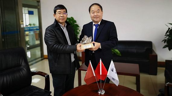 ユナイテッドグラインディング中国のSTUDERのシニアセールスマネージャーZhao Jianwei氏(右)は、Wuhan Hangda Aero科学技術開発有限公司の副ゼネラルマネージャーYongjun Wang(左)にスイスの鉱石を授与します。